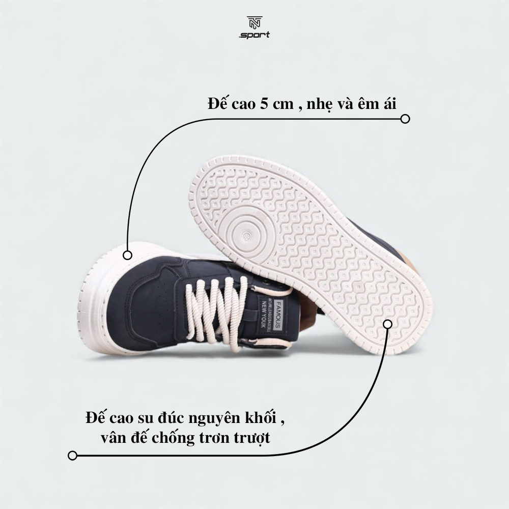 Đế giày làm từ cao su cao cấp với các rãnh sâu tăng độ bám, giảm trơn trượt. Lót giày dày – êm – đàn hồi giúp giảm áp lực bàn chân khi đi bộ hoặc đứng lâu. Đế cao 3cm giúp tăng chiều cao tự nhiên nhưng vẫn giữ độ cân bằng, không gây chênh vênh.